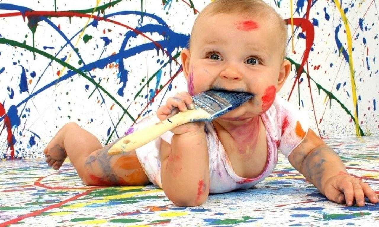 - одежду малышу для творчества, которую не жалко пачкать. Если в доме тепло, то просто разденьте кроху. Не бойтесь, что он запачкается. Отмыть детские краски легко
