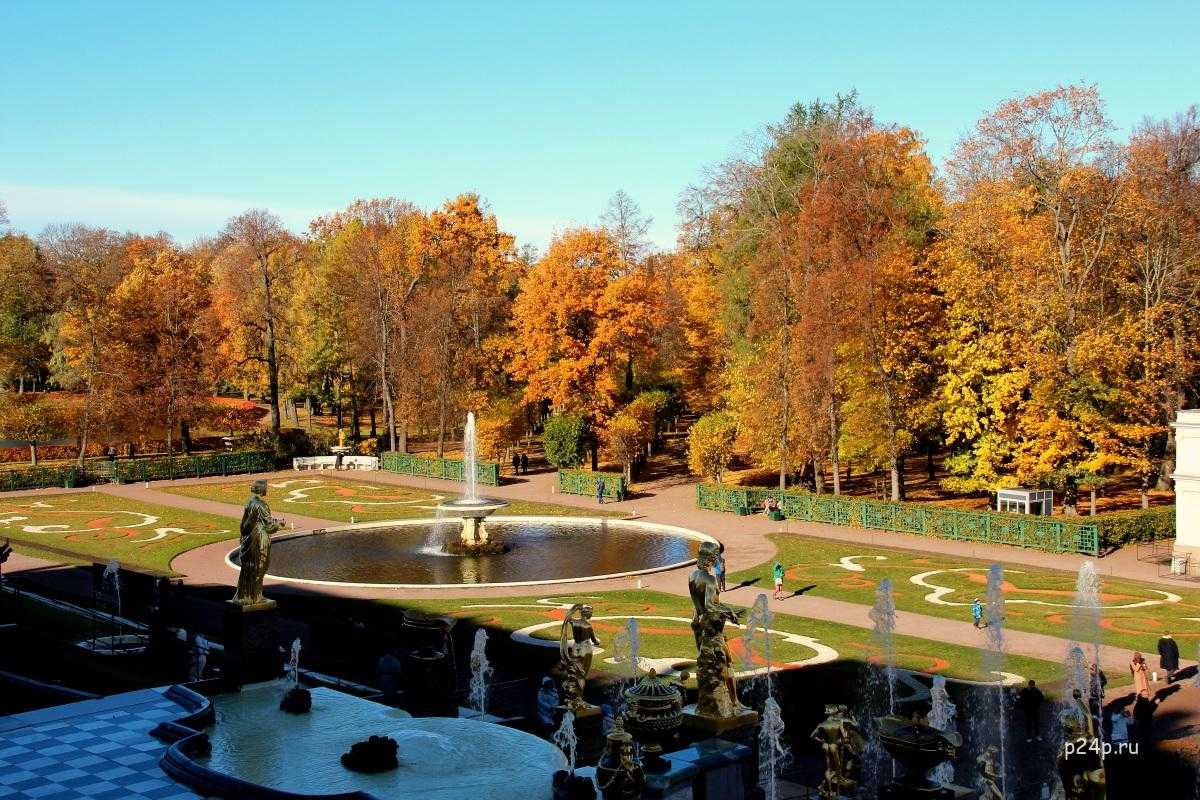 Нижний парк Петергофа в периодом золотой осени завораживает своей красотой. Фонтаны выключают обычно в середине октября. Обычно до этого времени уже наступает золотая осень.