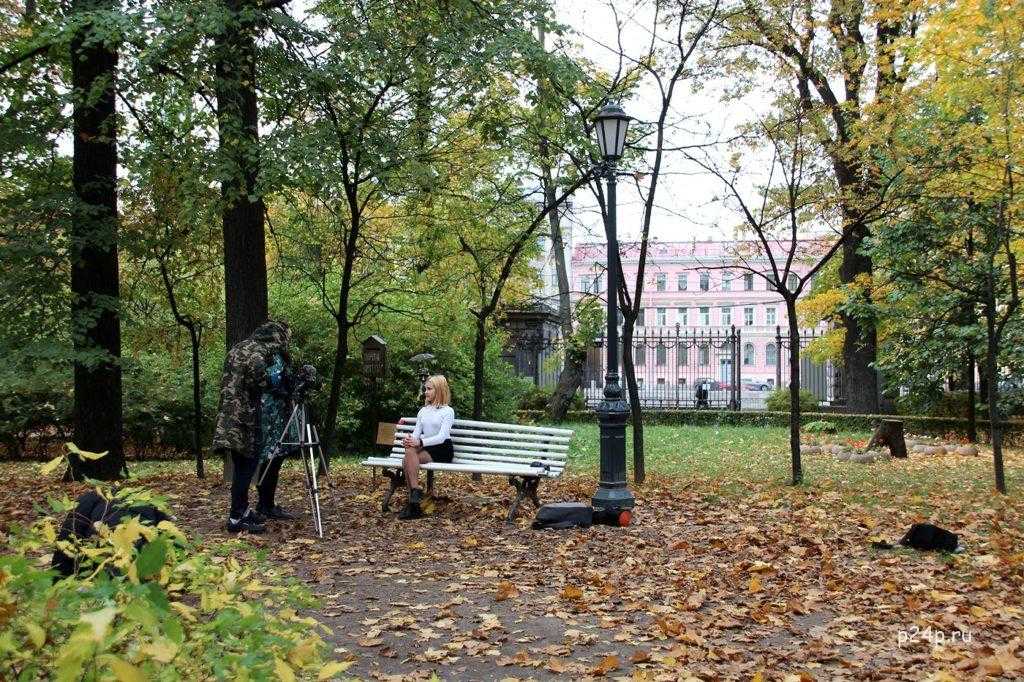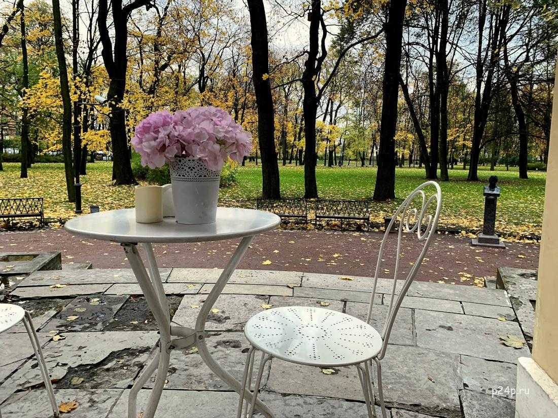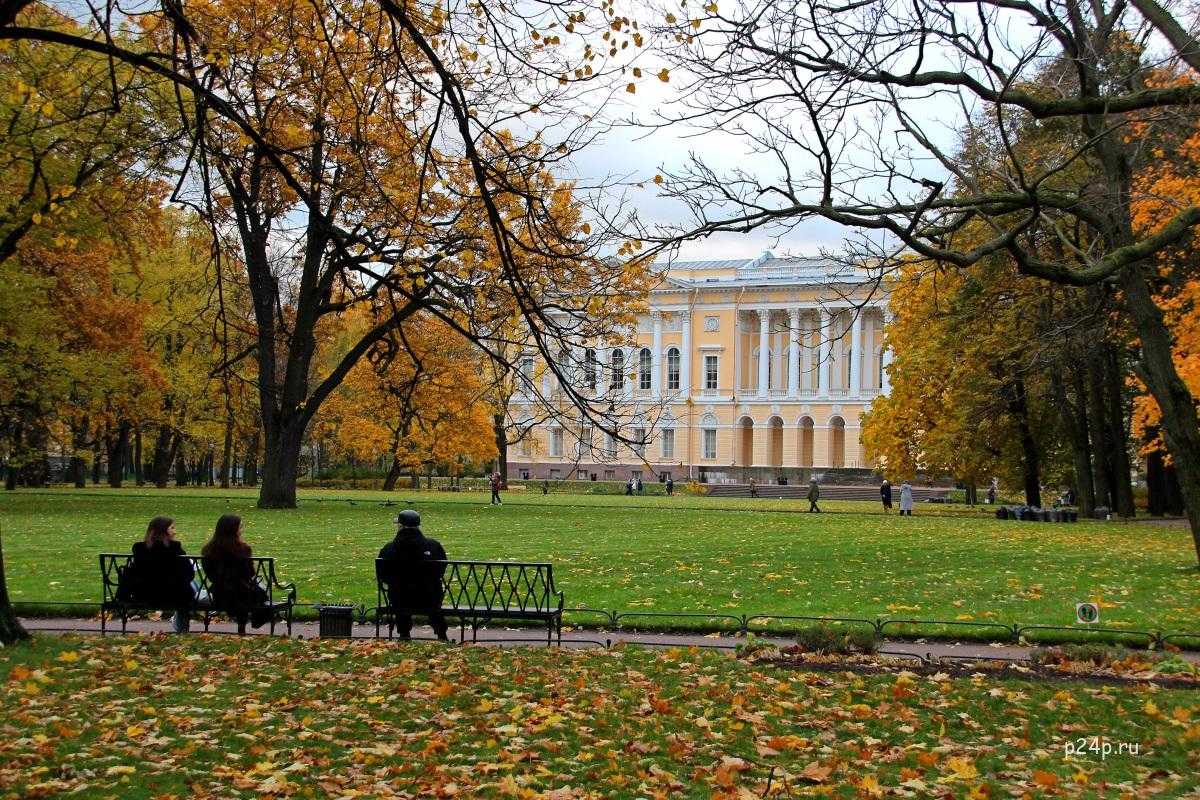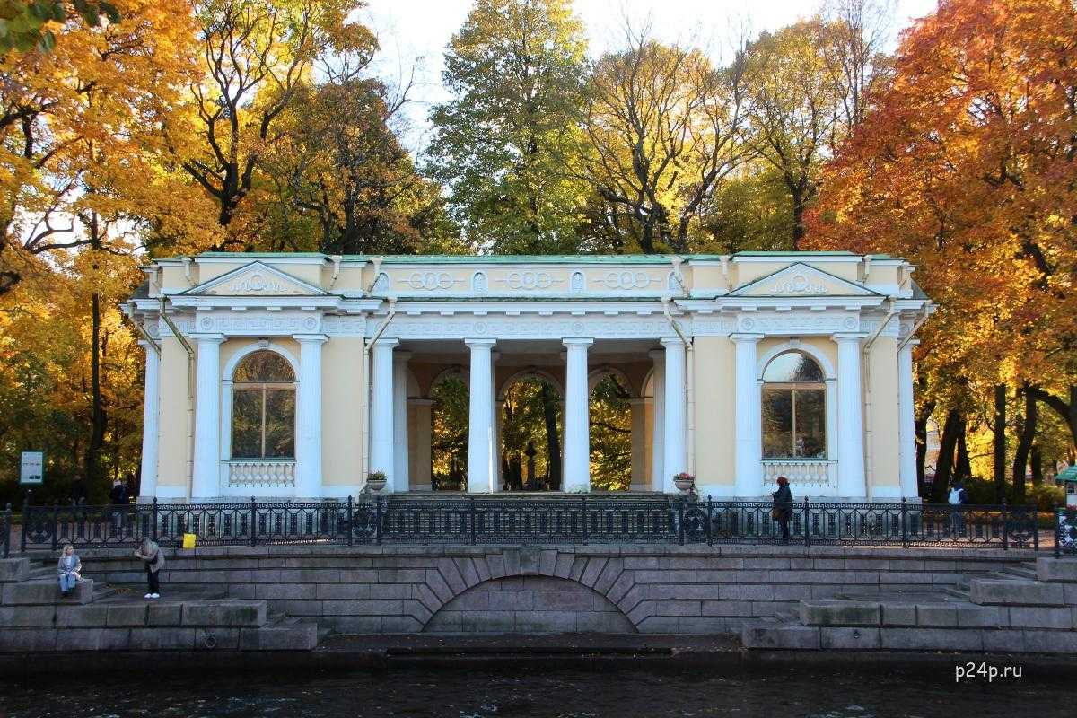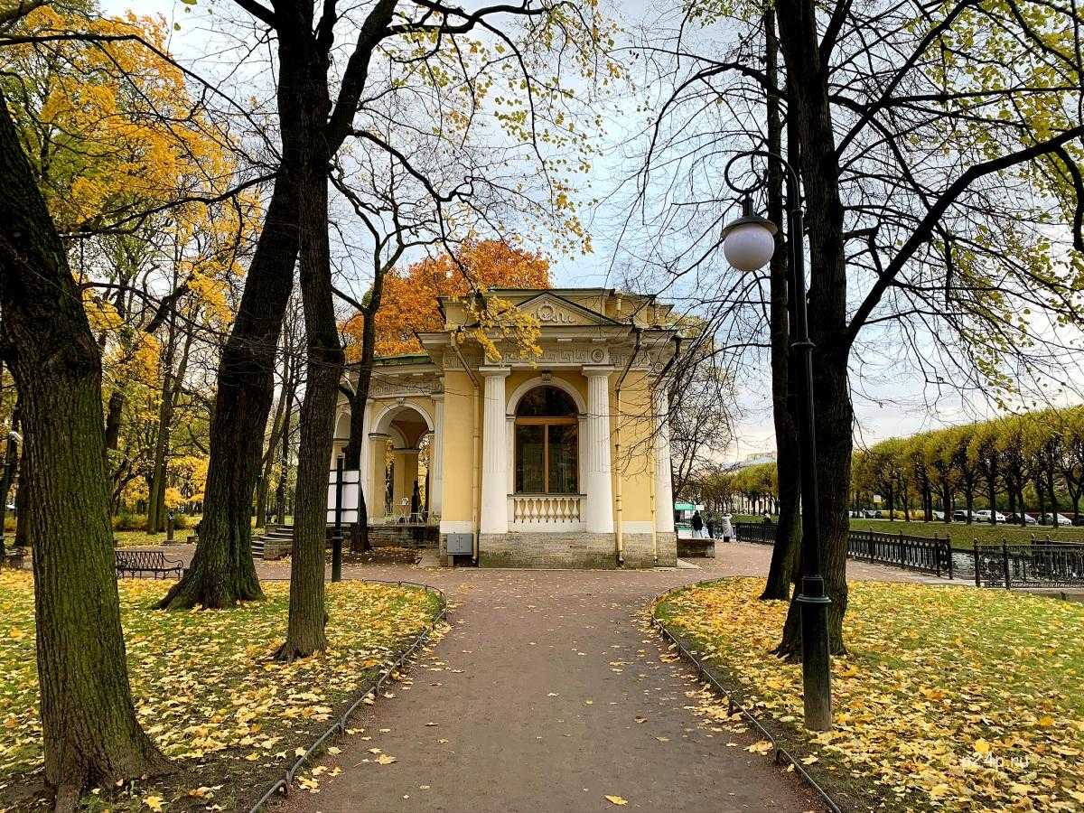 В павильоне Росси в Михайловском саду до поздней осени работает кафе. Можно сделать красивые осенние фотографии.