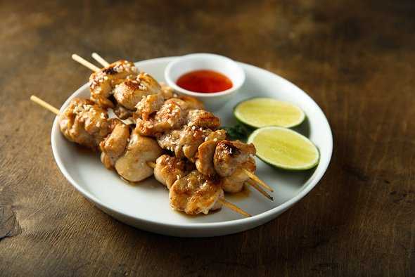 Подготовьте мангал. Нанижите мясо на деревянные шпажки и готовьте на углях, часто переворачивая, 10–15 минут. В конце смажьте подготовленным сладко-острым соусом, посыпьте семенами кунжута и зеленым луком и подавайте на стол.
