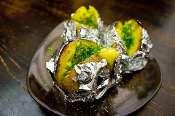Вымойте крупные клубни картофеля, заверните в несколько слоев фольги и положите в угли. Ничего не случится, если вы будете одновременно продолжать готовить на мангале что-то другое и даже подкладывать дрова или подсыпать уголь. Примерно минут через 40 достаньте картофель (проверьте готовность деревянной шпажкой), переложите на поднос, дайте немного остыть. Разрежьте каждую пополам (не разворачивая фольгу), выложите на тарелку, добавьте немного сливочного масла и соли и разомните. Подавайте с соусами или топингами на выбор: