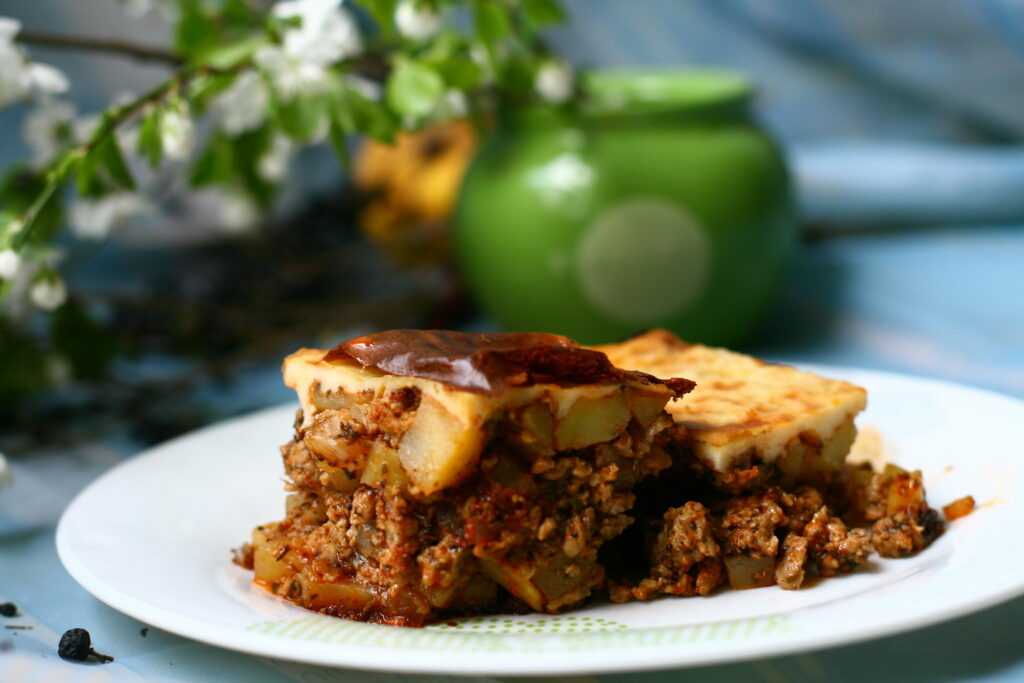 - Запеканка Мусака из баклажанов, мяса и картофеля под соусом бешамель.