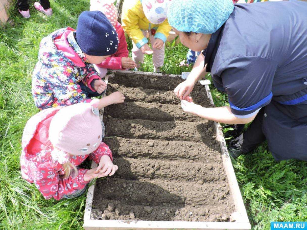 Наблюдение за посадкой семян цветочных растений и овощей на грядках.