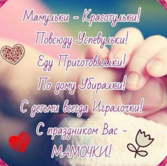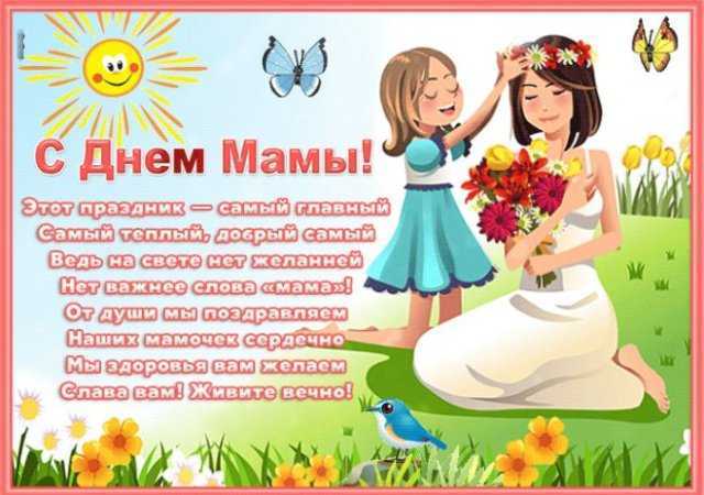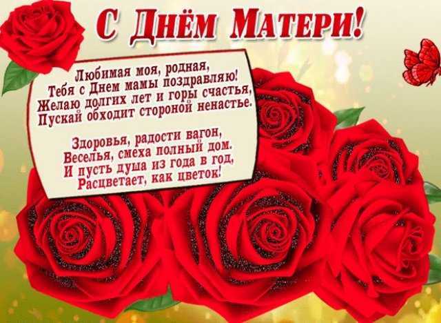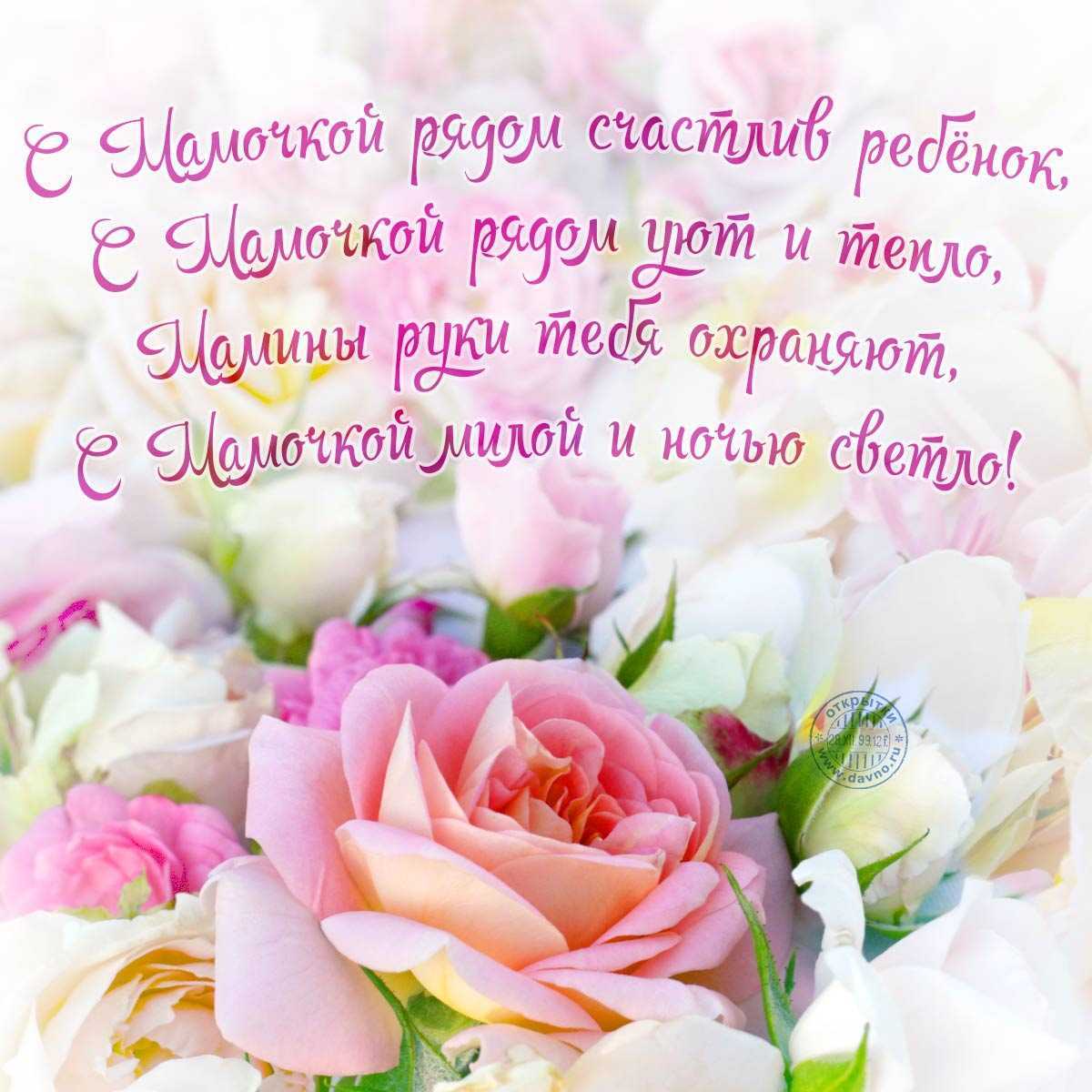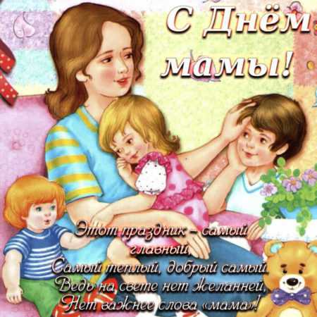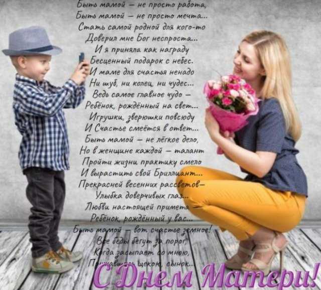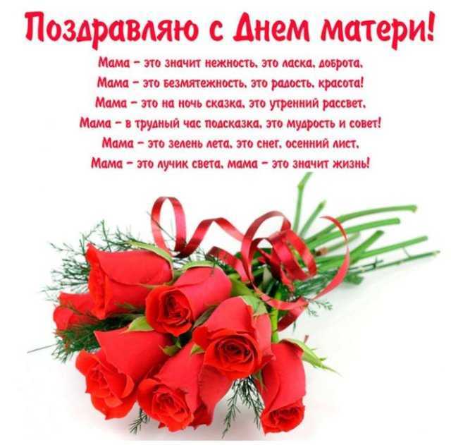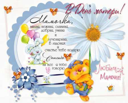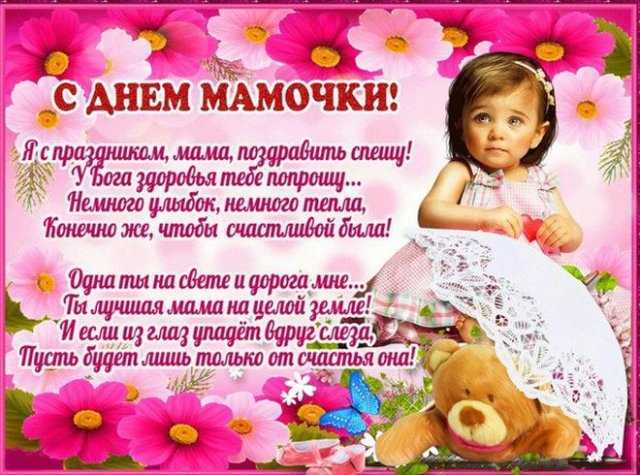 День матери — светлый и благородный праздник. Особенно сильно он контрастирует с сегодняшней агрессивной окружающей средой, полной военных конфликтов и природных катаклизмов. В эру сложных международных и междоусобных отношений каждый человек может переосмыслить свои ценности, чтобы стать еще лучше и еще чище: научится чтить традиции, уважать чужой труд, любить и почитать родителей. Именно материнская беспрекословная любовь, способная стать примером доброты, искренности и самопожертвования. Давайте же поздравим наших мам в День матери самыми теплыми пожеланиями и красивыми картинками со стихами от близких людей. Давайте поблагодарим дорогих родительниц и скрасим их праздник приятными знаками внимания в виде красочных букетов, неожиданных телефонных звонков и симпатичных открыток в электронных письмах. Красивые картинки со стихам от близких людей с Днем матери ищите в следующим разделе.