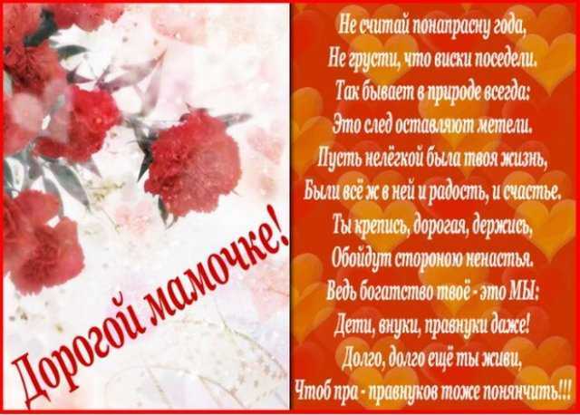 Мамочка наша родная,Эти нежные строки — тебе.Самой милой и самой красивой,Самой доброй на этой земле.Пусть печали в твой дом не заходят,Пусть болезни пройдут стороной.Мы весь мир поместили б в ладониИ тебе подарили одной.Но и этого было бы мало,Чтоб воздать за твою доброту.Мы всю жизнь, наша милая мама,Пред тобой в неоплатном долгу.Спасибо, родная, за то, что растила,За то, что взамен ничего не просила.Что горе и радость деля пополам,Во всем лучшей доли желала ты нам.Красива, заботлива, нежно нежна,Ты нам ежедневно и вечно нужна!