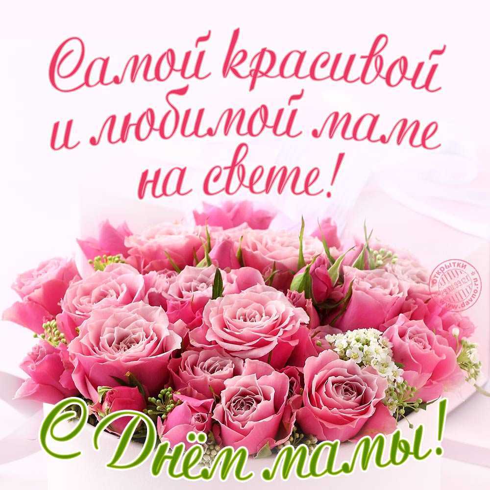 Поздравительная открытка на День матери с шикарными красивыми розовыми розами в коробке. Подпись на открытке: самой красивой и любимой маме на свете!