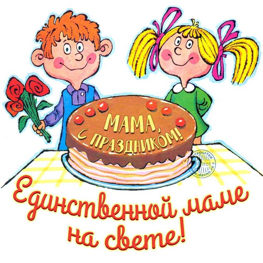 Красивая и добрая картинка с днём матери с изображением мальчика и девочки с тортом для мамы. Подпись на картинке: мама, с праздником! Единственной маме на свете!
